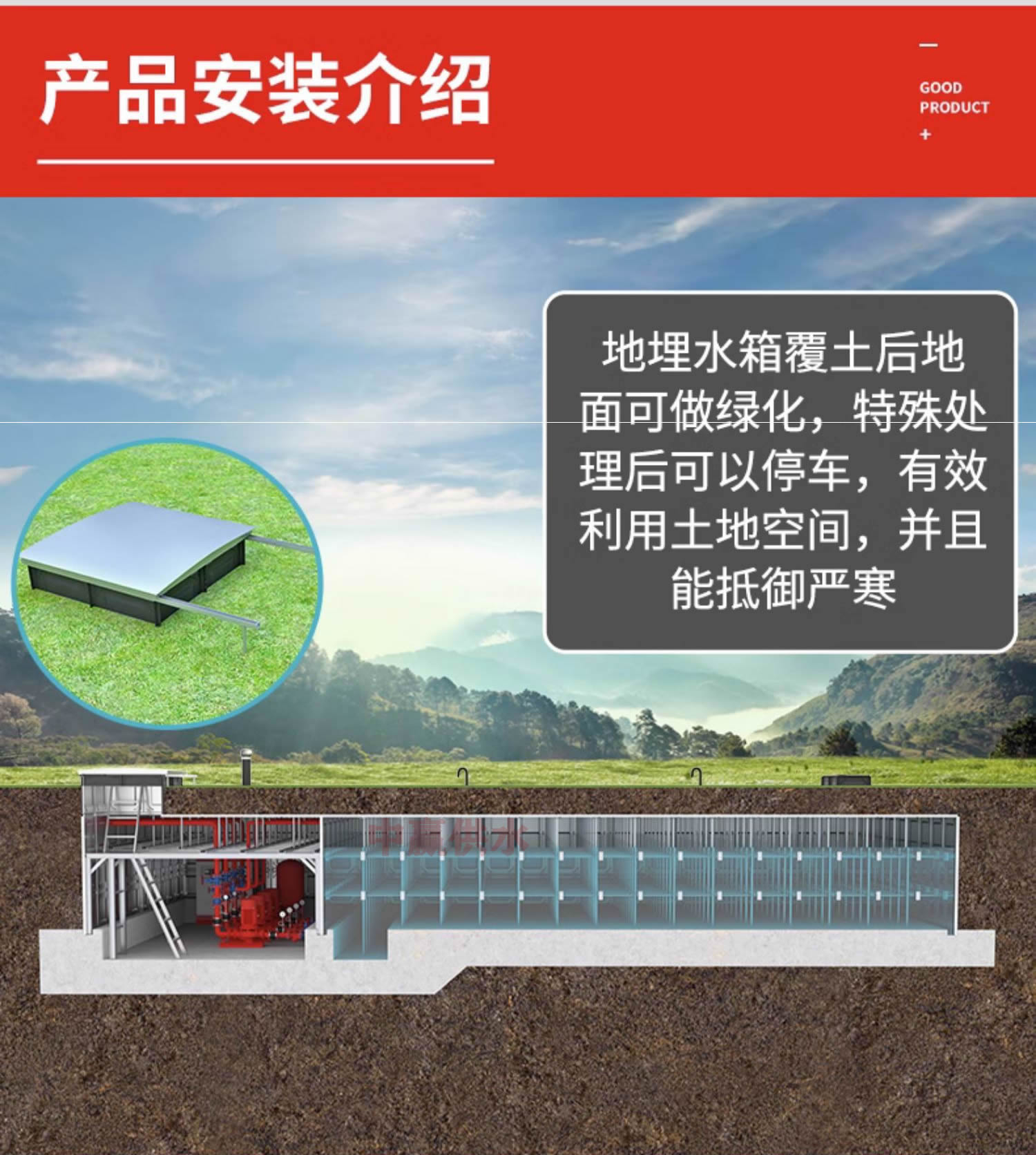 地下箱泵一體化無浮泵站的設計允許其直接埋入地下,不需要在地面或單獨設置泵房,也不需要安裝水箱底板,而是直接使用混凝土筏板作為水箱底板,這種設計節約了空間。它可以在城市等人口密集的地方使用,也可以在水資源缺乏的偏遠地區使用,適應性強?。